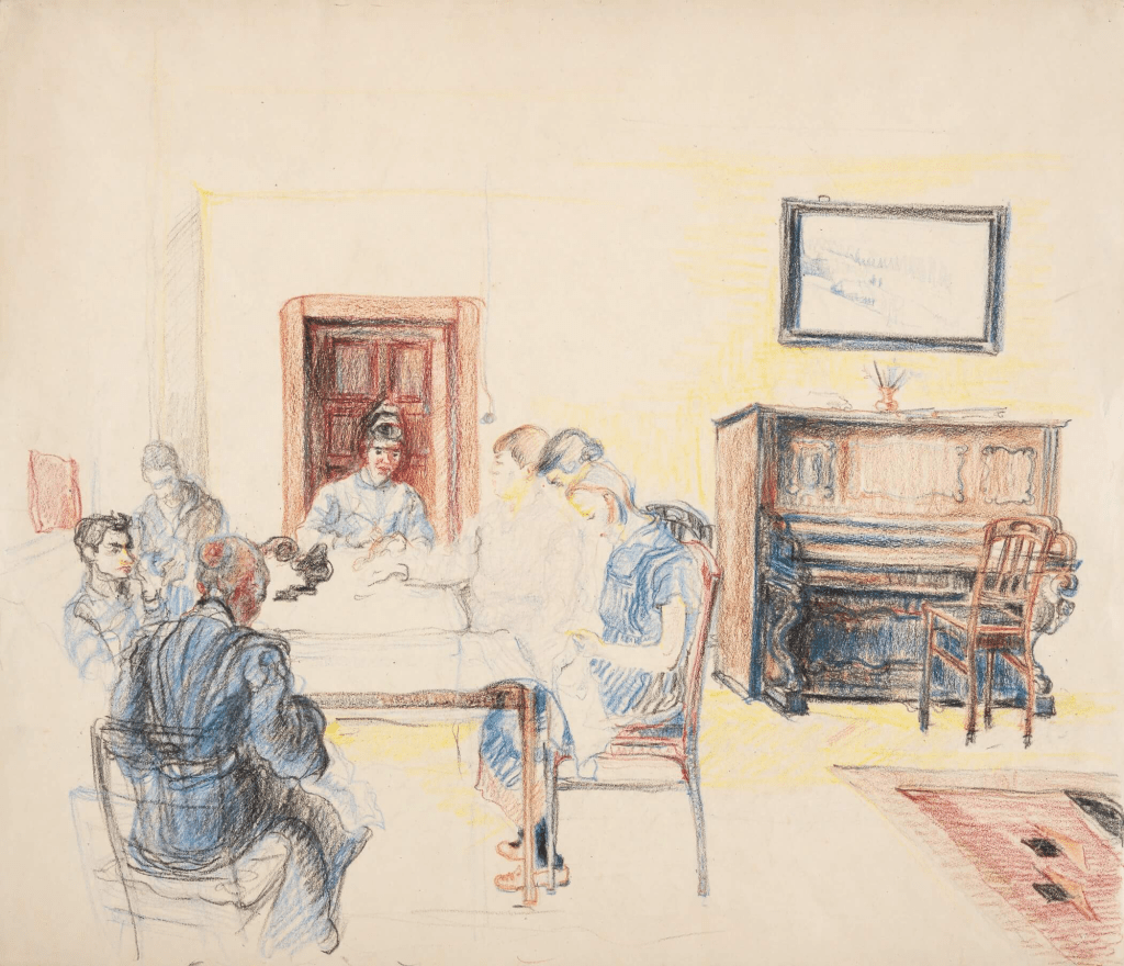 Elfriede’ a story is tragic but out of tragedy she never stopped creating art. Struggling with mental health and lifelong poverty she was in and out of psychiatric wards through her life. While admitted she would paint her experience inside the hospitals, giving viewers and inside look into her life there in the artistic style of “New Objectivity”. Art critics praised her work, and in 1929, she successfully exhibited in both group and solo shows.. In 1932 she was admitted to the Dresden City Hospital and then transferred to the Arnsdorf State Institution. It was there that doctors diagnosed her with schizophrenia. She found ways to cope with her suffering through art, chronicling life at Arnsdorf through numerous drawings and paintings. On July 14th, 1933 the ‘Law for the Prevention of Hereditarily Diseased Offspring’ was passed by the Nazi government mandating the forced sterilization of individuals with physical and mental disabilities. In 1935 Elfriede was subjected to this forced procedure. After this violation, she no longer created art, she was never able to recover from her deep depression and trauma. Ultimately, she fell victim to ‘Action T4’, the centralized murder program run throughout Nazi Germany. By the Summer of 1940 Arnsdorf had become an intermediary for the Pirna-Sonnenstein extermination center. On July 31, 1940 Elfriede became one of the 53 women on the fourth transport from Arnsdorf to Pirna. She was murdered in the gas chambers the same day.