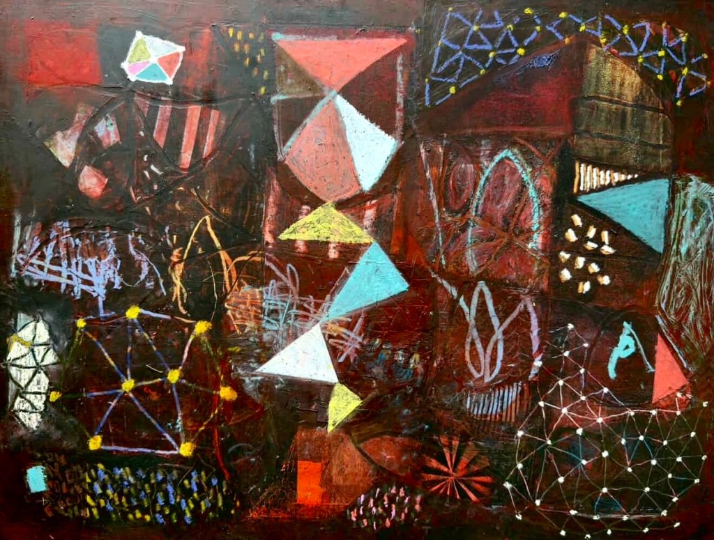 The first piece we will explore using coquelicot is by Anne Hebebrand. An abstract painter, Hebebrand has a profound sense of color and composition. I was stoked when I saw her post a photo of this piece below, because it has an intriguing dash of coquelicot in it! In person, Anne’s paintings are extremely textured. They tempt the viewer to reach out and touch and dig through the layers of paint, yearning to uncover what hides beneath. With valleys and mountains of applied paint and cold wax this piece feels as if you’re looking at a planar view of multiple dimensions. A place where galaxies and timelines are all connecting, building, exploding, stretching, twisting in the fabric of time. There, just in the middle, we find our angular path guiding us, like Alice through the looking glass, on a descent towards a foreign, coquelicot tinted world. I asked Anne if there was a specific intention behind the vibrant mark to which she said;