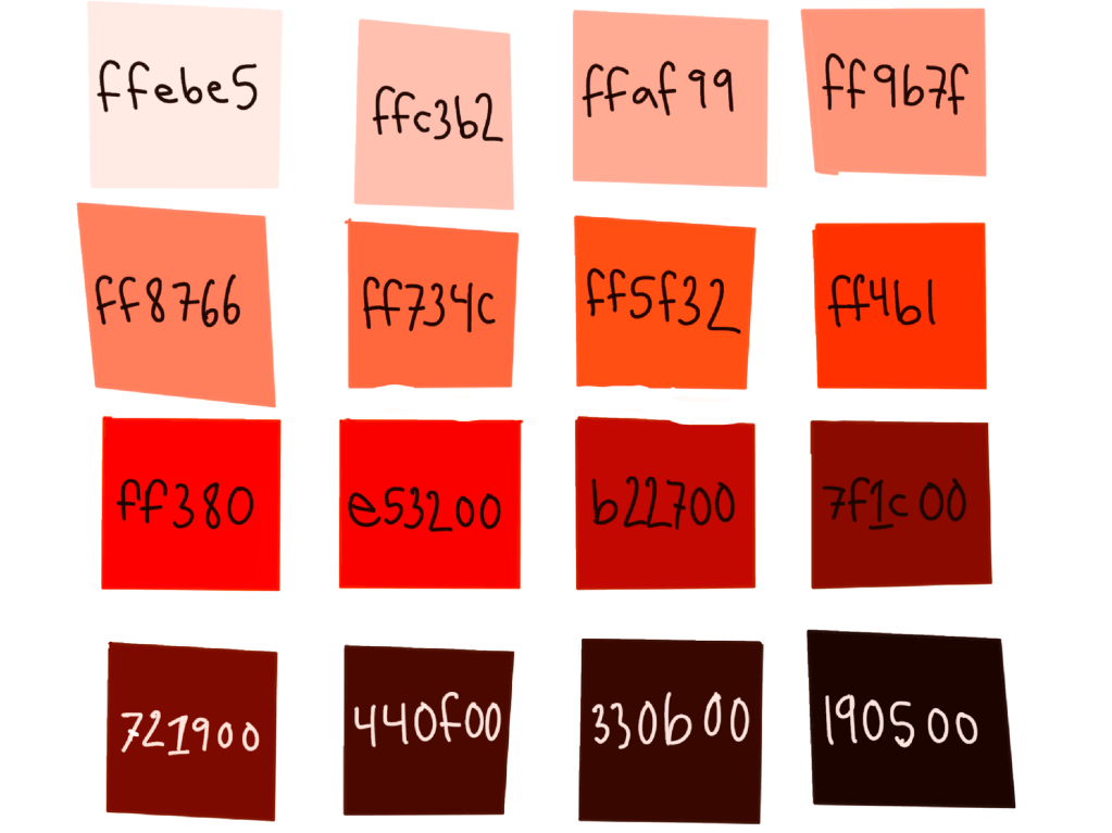 I did some digital experimenting for y’all with the color using its registered hexadecimal and I was surprised by my results of tint and shade. Upon tinting the pure shade I expected to get some sort of pinky hue but I was mistaken! When tinting coquelicot you get progressively more orange colors! Ultimately, you get the perfect peach hue. When shading coquelicot, however, you get rich, earthy reds and a fabulous black that’s perfect for landscape work!